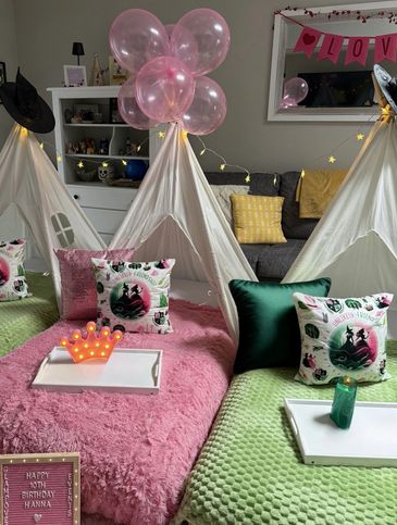 Step into the world of Wicked with this enchanting tent theme! Inspired by the unlikely friendship of Glinda and Elphaba, this setup blends soft pinks, bold greens, sparkling accents, and themed pillows for the ultimate Broadway-inspired sleepover. Complete with cozy blankets, glowing lights, and whimsical décor, it’s perfect for any fan of magic, musicals, and unforgettable nights with friends.